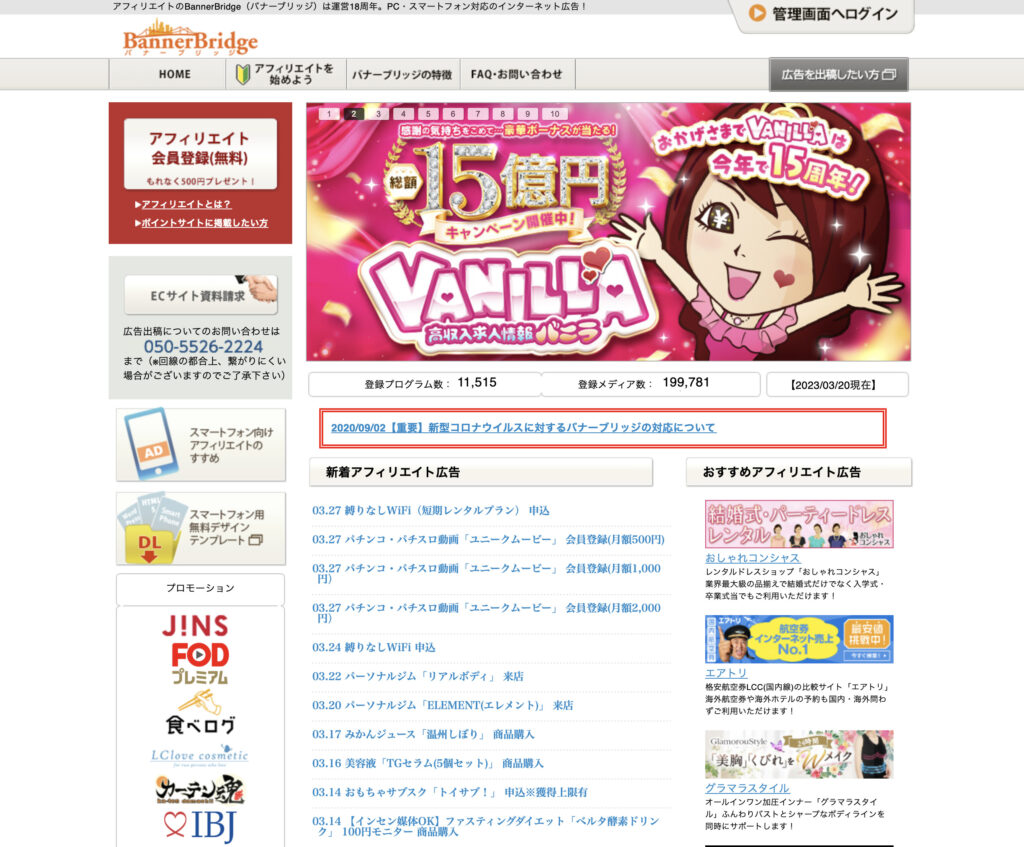 バナーブリッジは2003年からアフィリエイトサービスを提供している老舗でアダルト以外の一般案件も取り扱っているため非常に守備範囲の広いASPと言えるのよ(ΦωΦ)フフフ・・