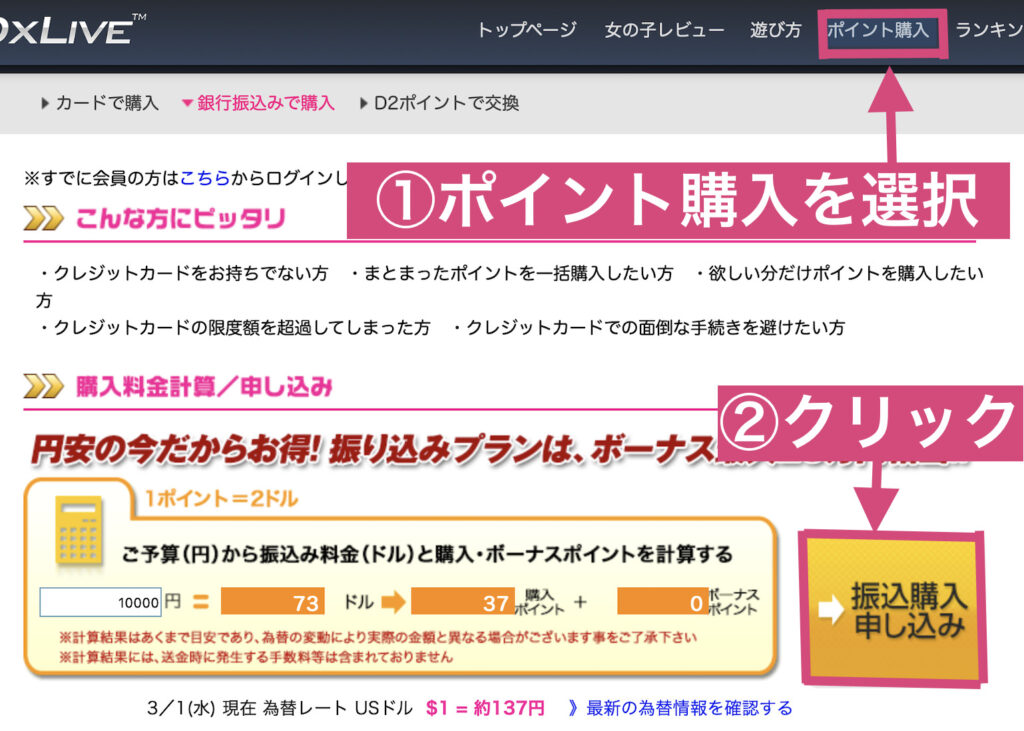 振込の場合はDXLIVE公式サイトの上部にある【ポイント購入】→【振込購入申し込み】をクリックしちゃおう〜!