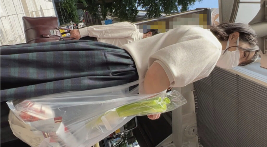 - 00:38~お菓子コーナーで追い抜く。左薬指にシルバーの指輪、主婦のよう。